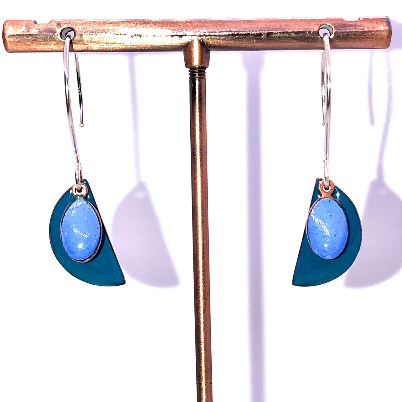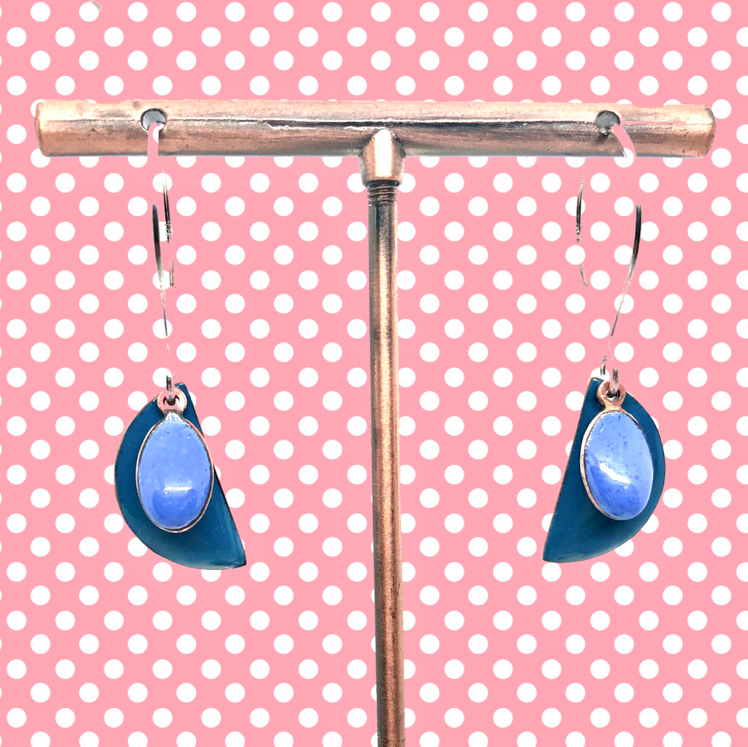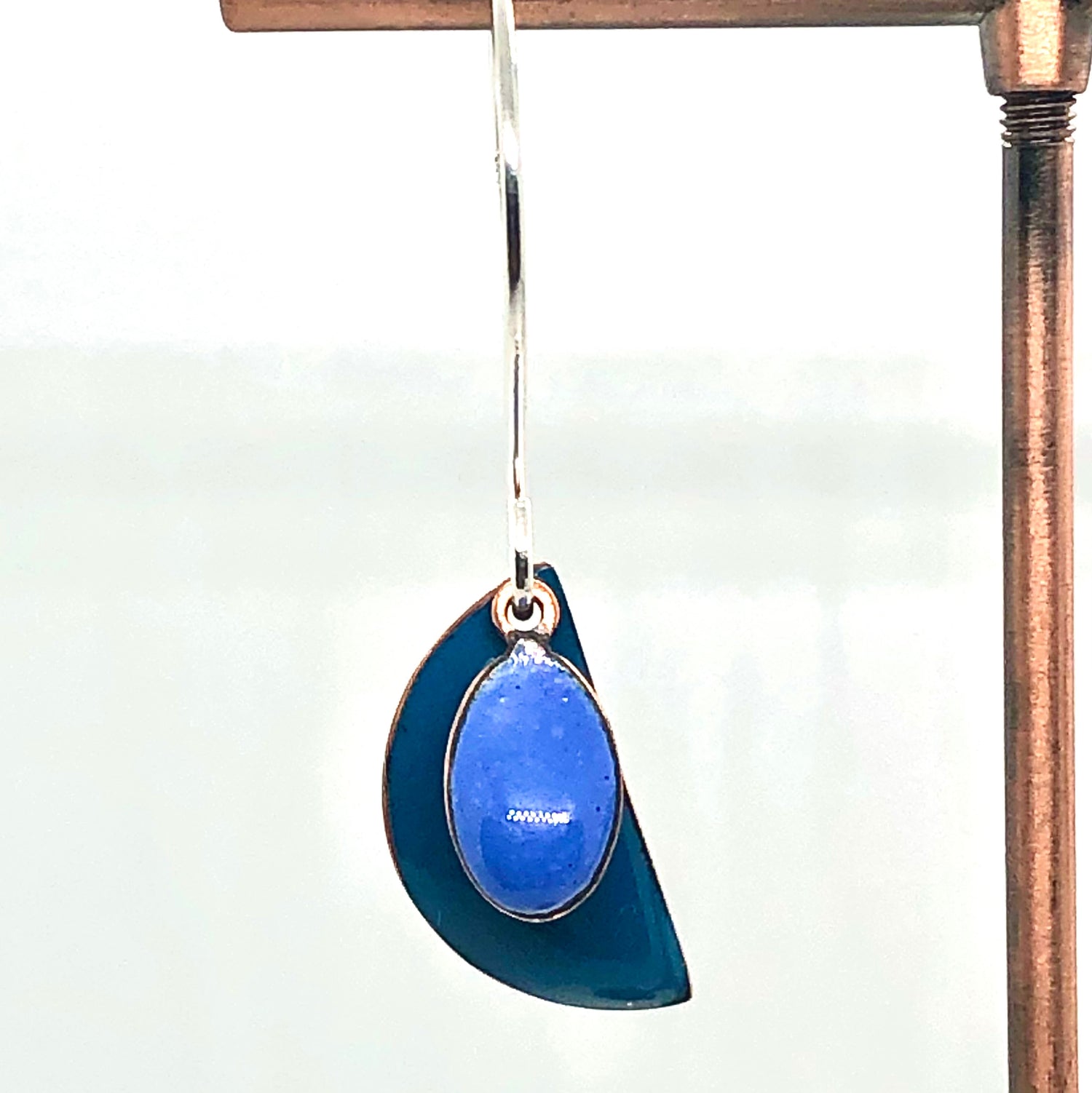 Copper based earrings with a vitreous (glass) enamel coating.