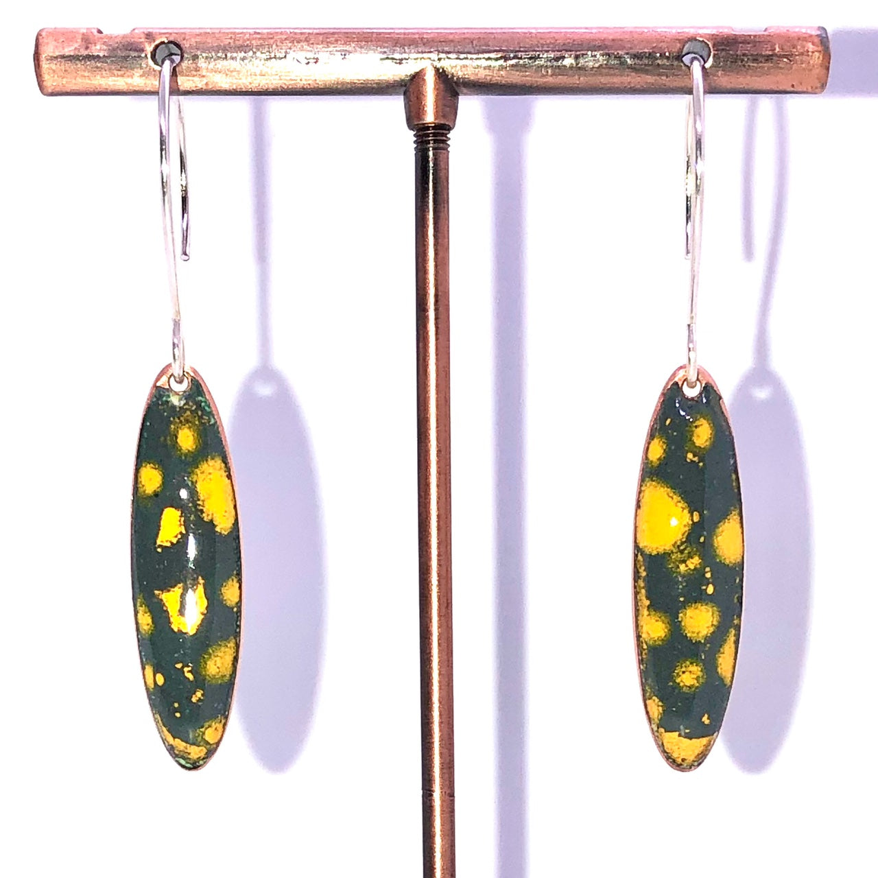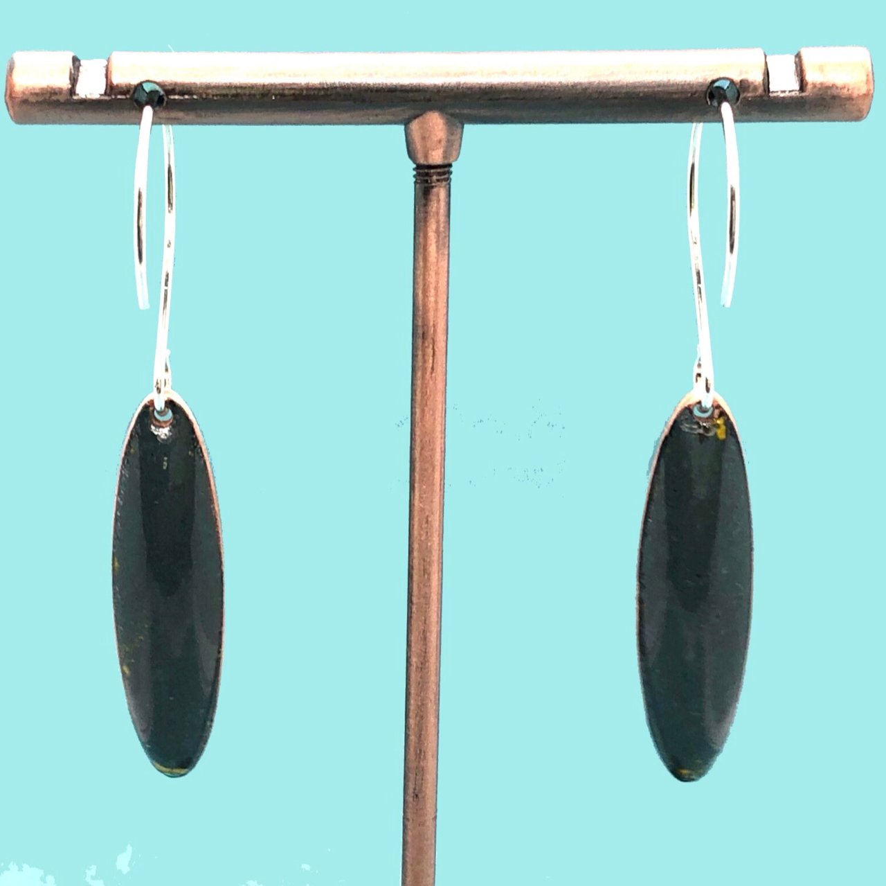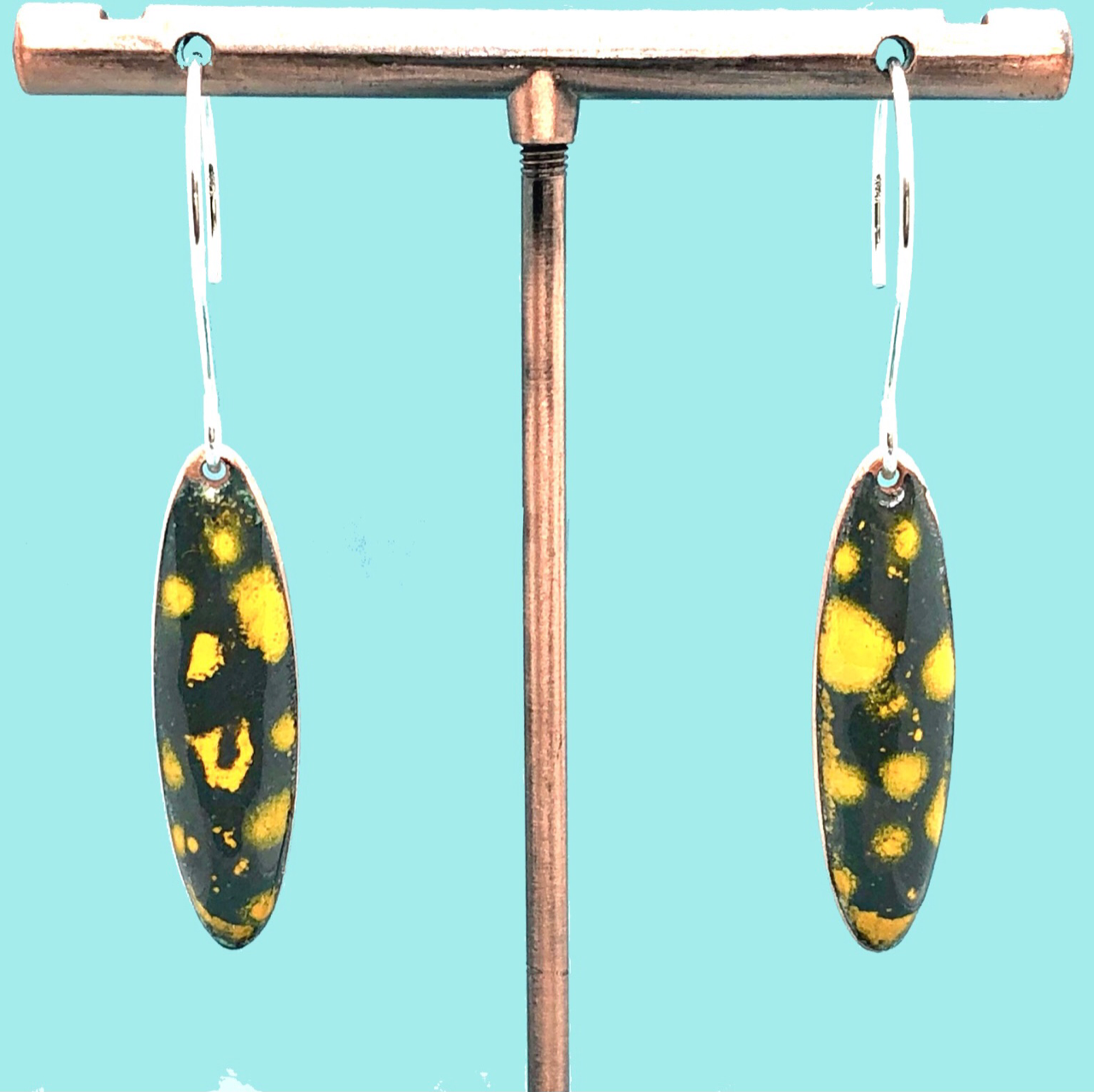 Copper based earrings with a vitreous (glass) enamel coating.