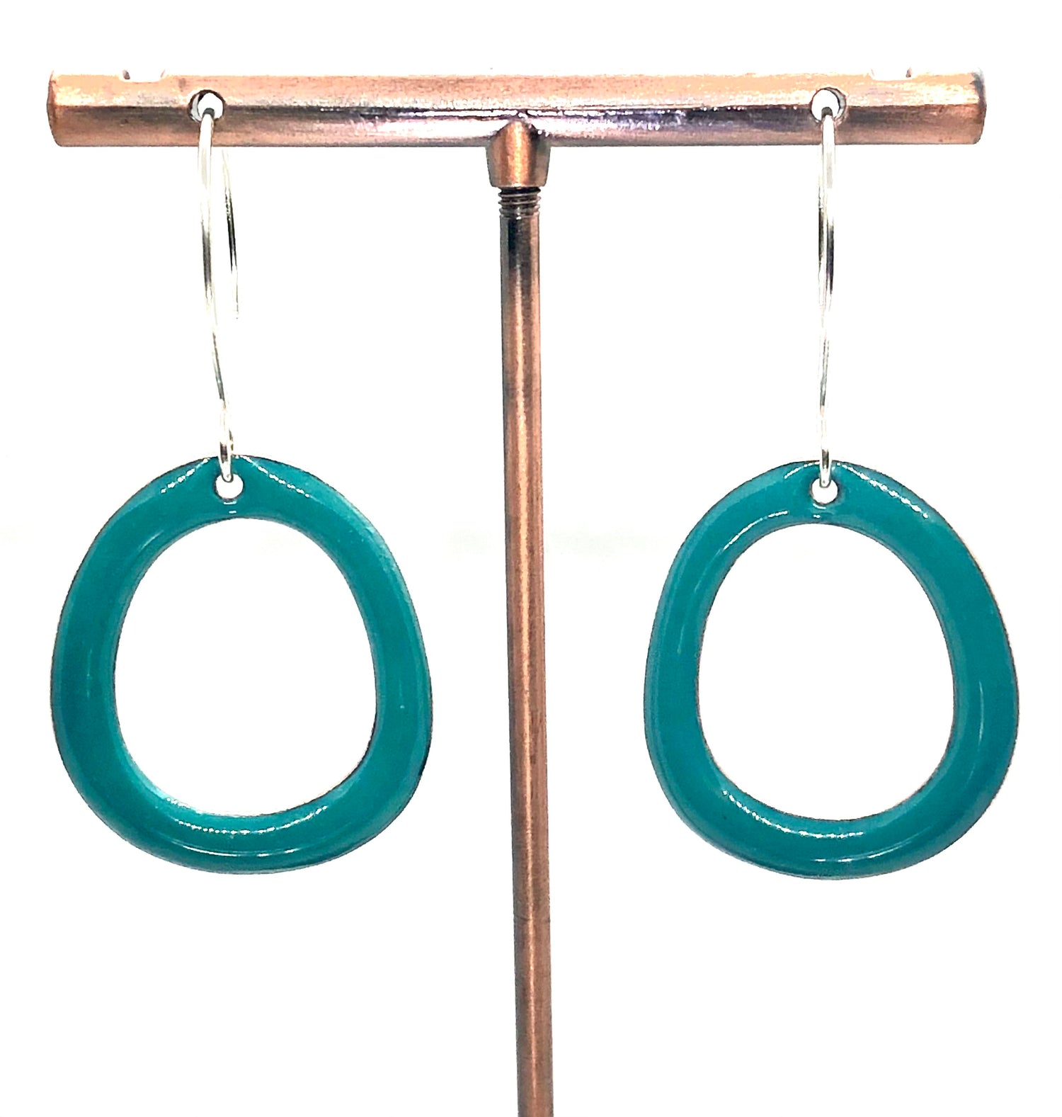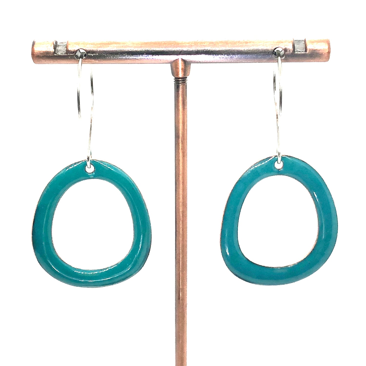 Copper based earrings with a vitreous (glass) enamel coating.