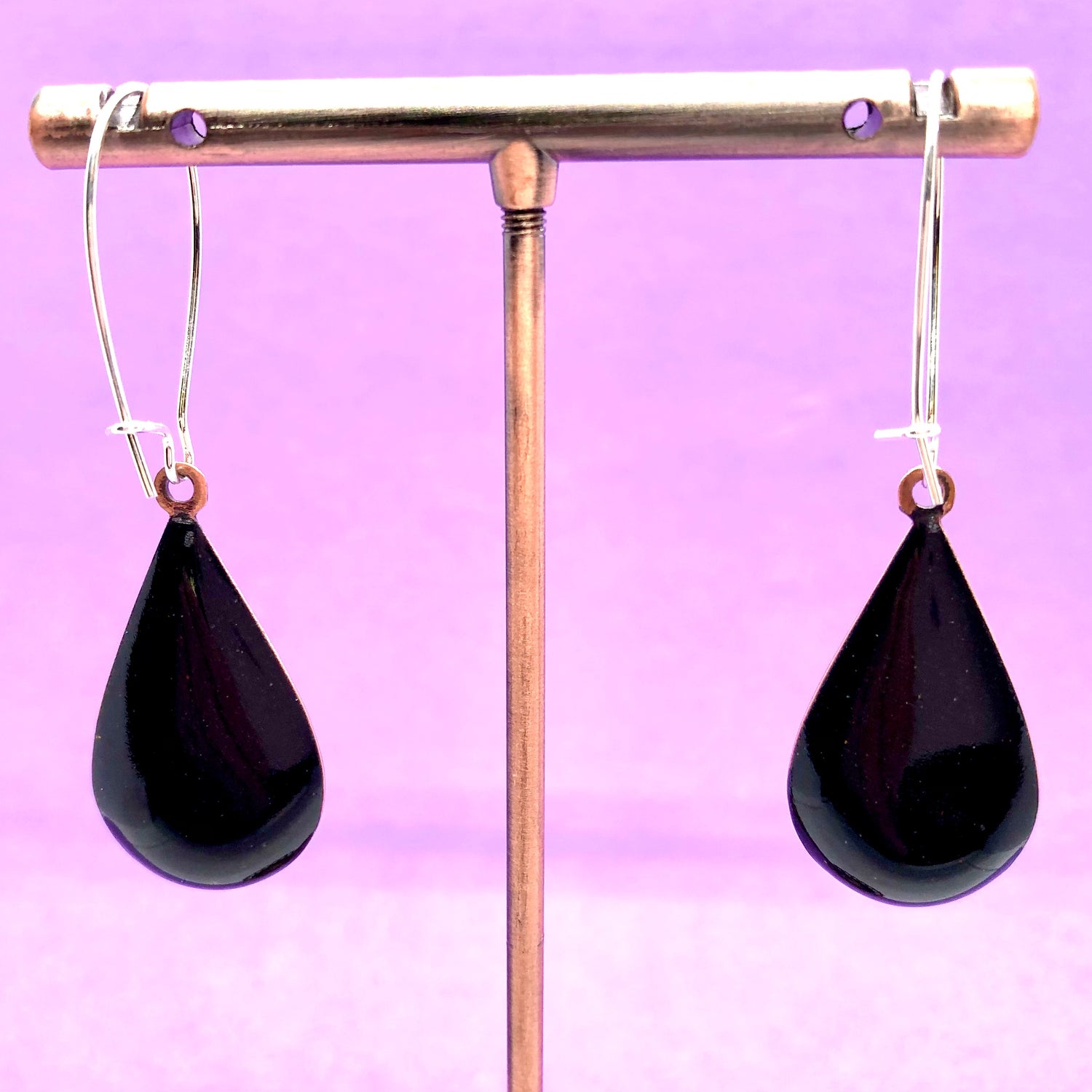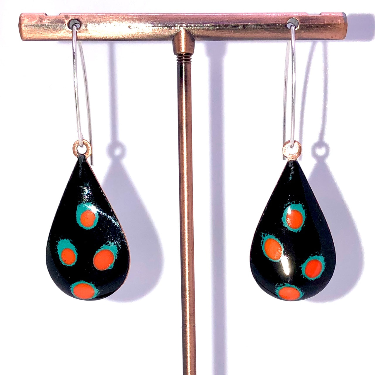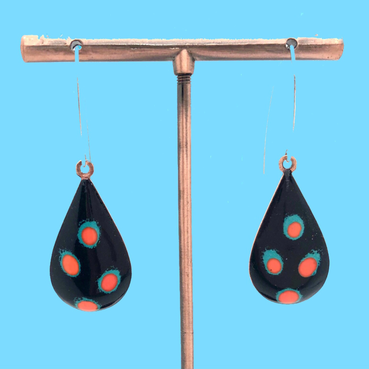 Copper based earrings with a vitreous (glass) enamel coating.