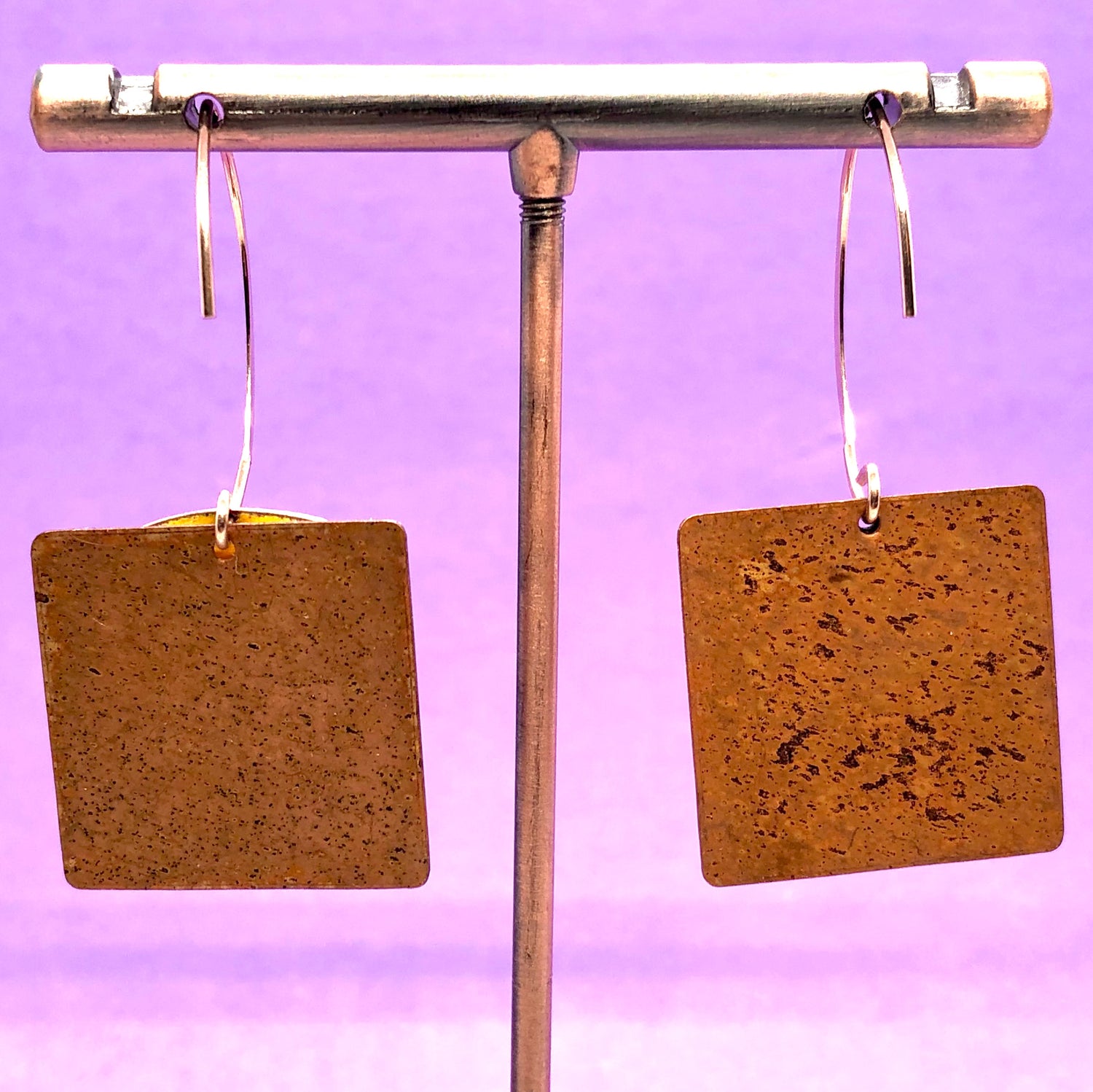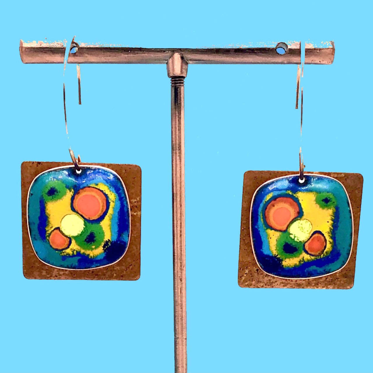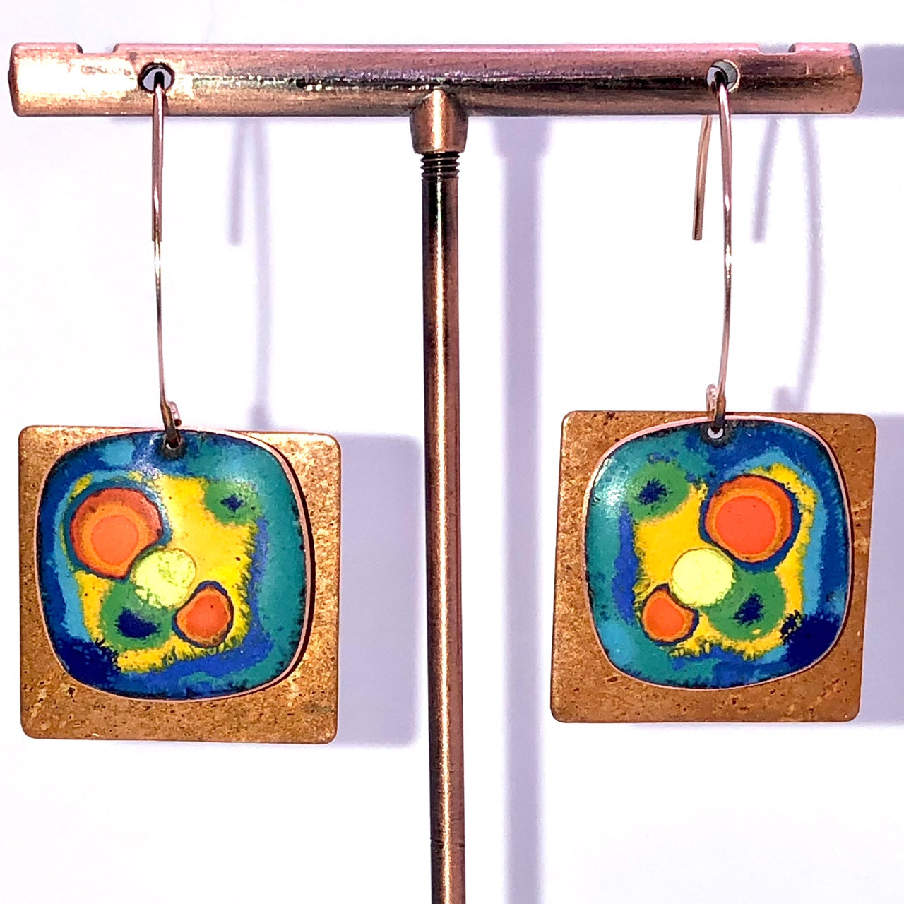 Copper based earrings with a vitreous (glass) enamel coating.