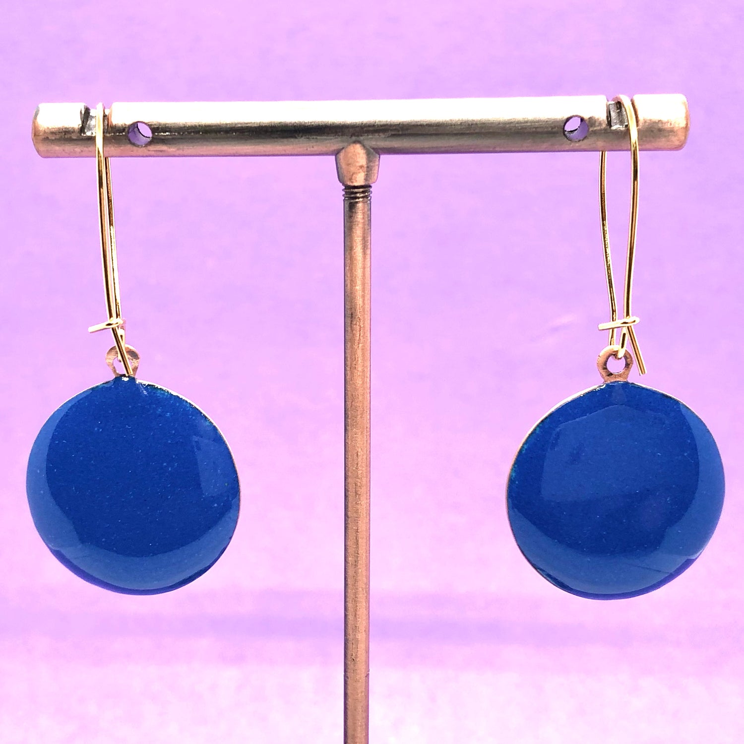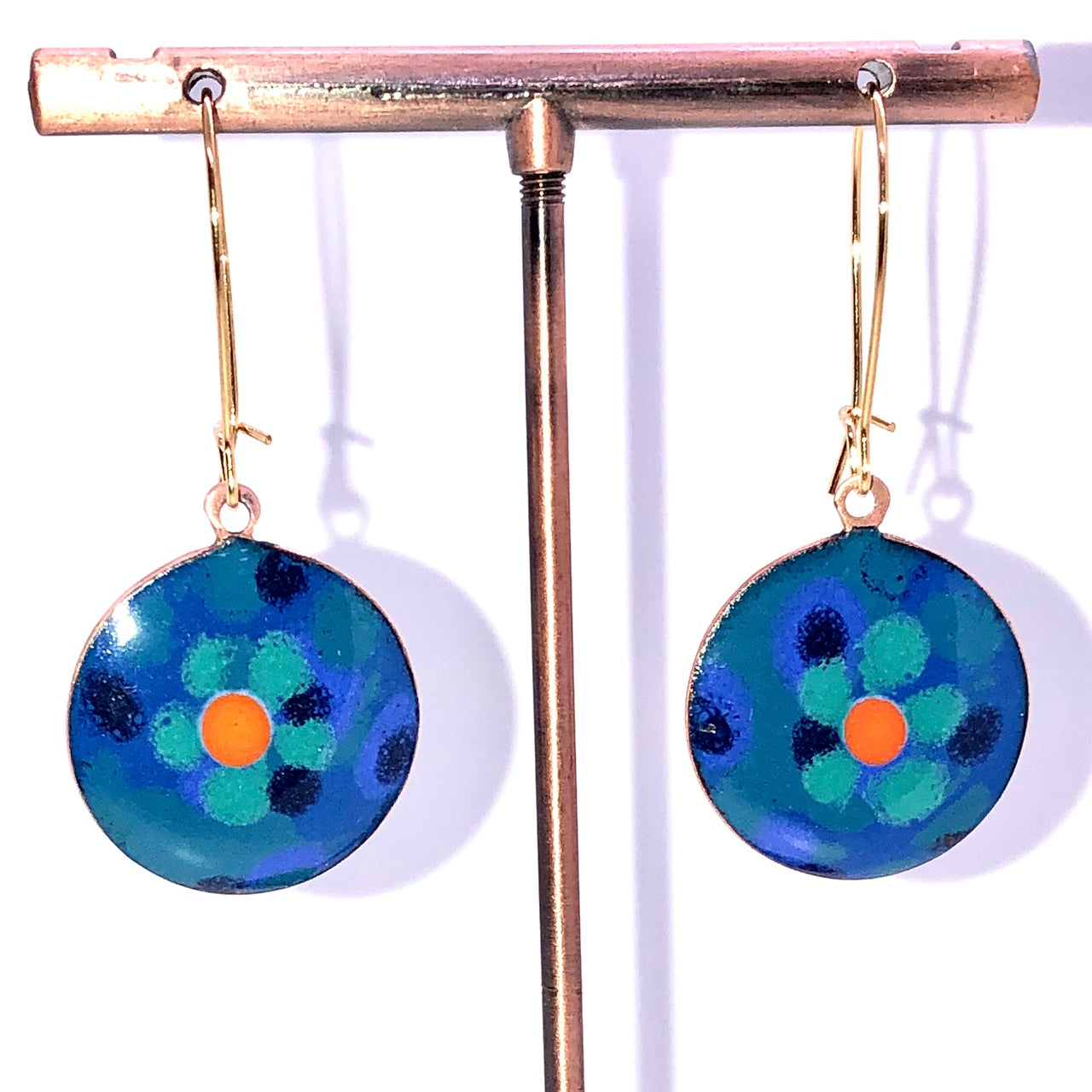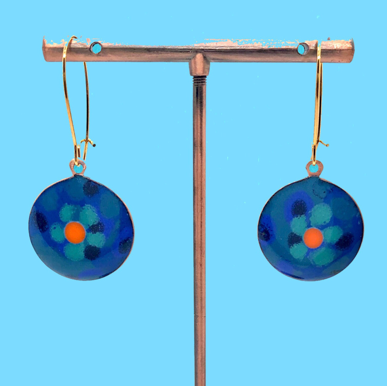 Copper based earrings with a vitreous (glass) enamel coating.