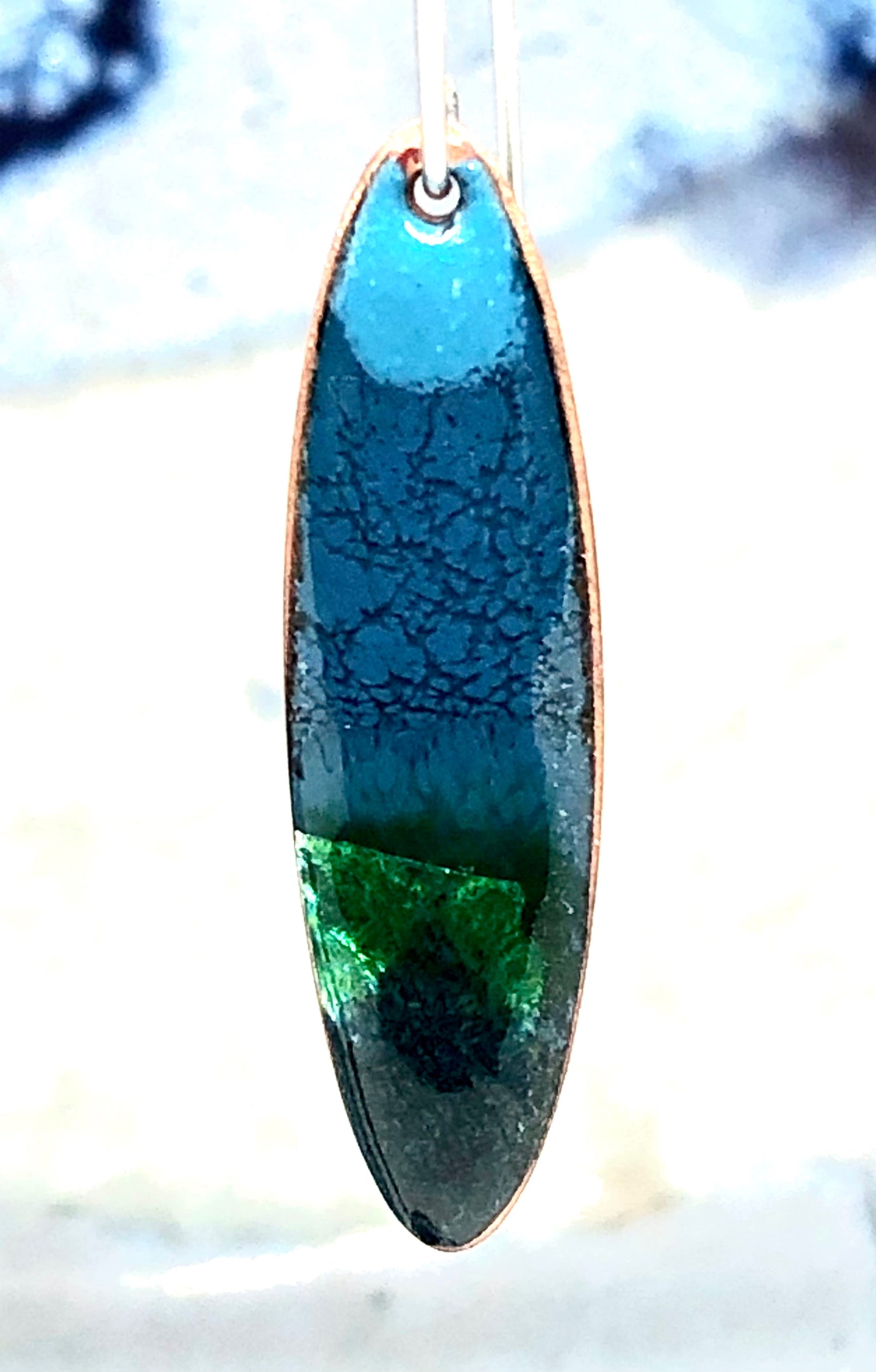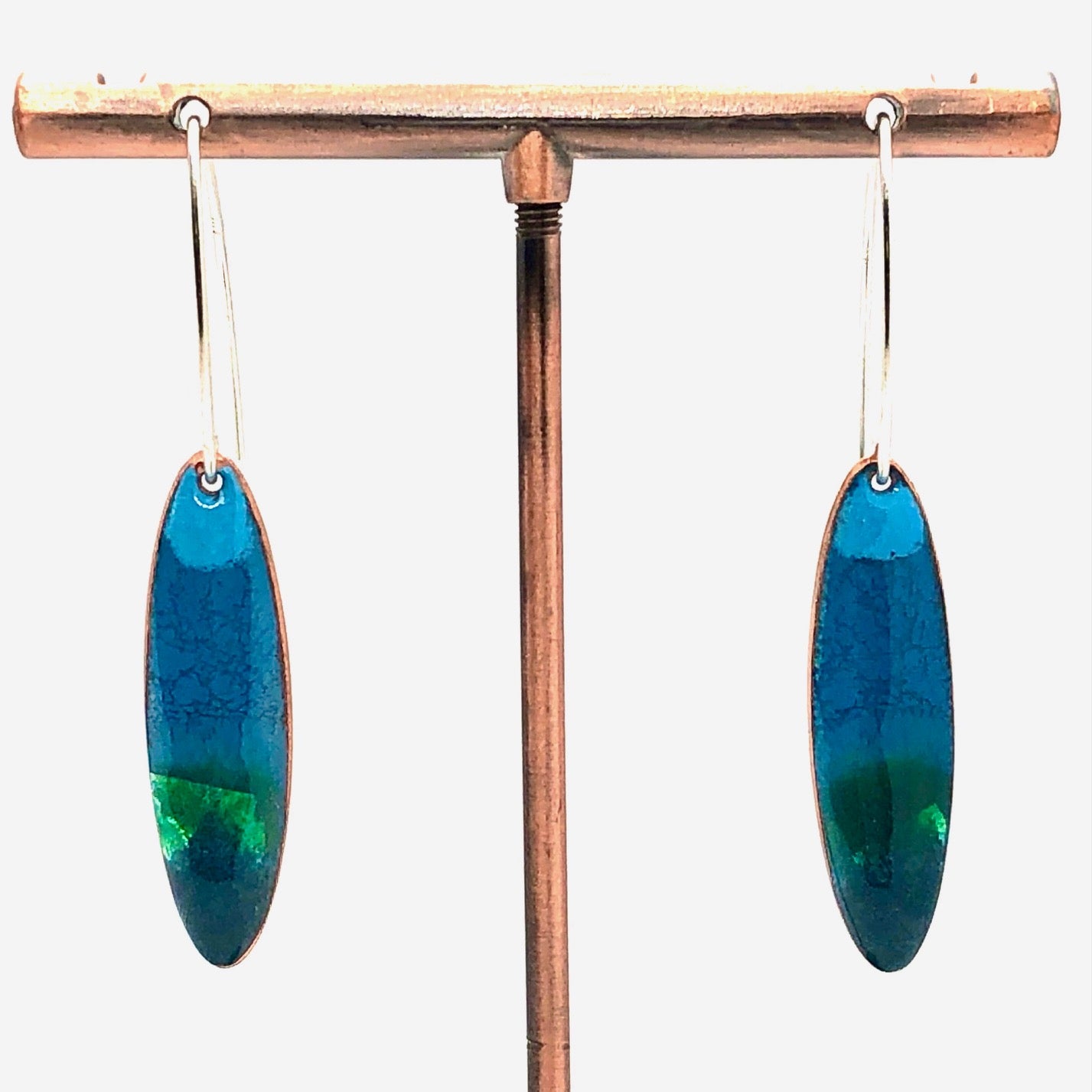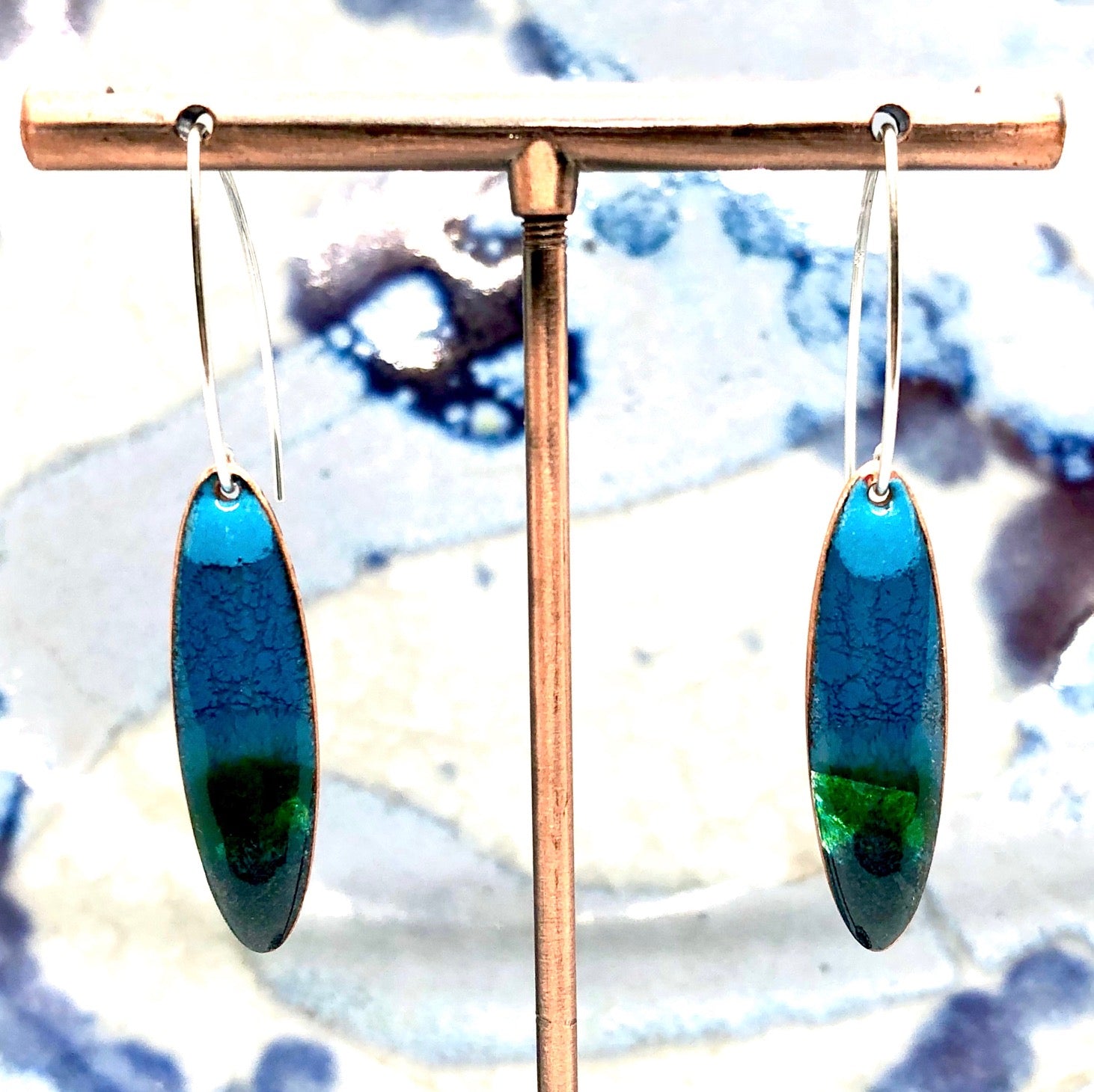 Copper based earrings with a vitreous (glass) enamel coating.